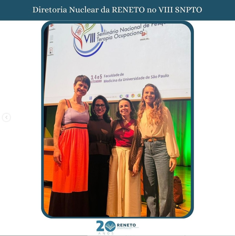 De 3 a 5 de setembro aconteceu o VIII Seminário Nacional de Pesquisa em Terapia Ocupacional (SNPTO), na Faculdade de Medicina da Universidade de São Paulo (FMUSP), em São Paulo (SP), que foi organizado pelo Mestrado Profissional Terapia Ocupacional e Processos de Inclusão Social, da Universidade de São Paulo (MPTO-USP), e pela Rede Nacional de Ensino e Pesquisa em Terapia Ocupacional (RENETO).