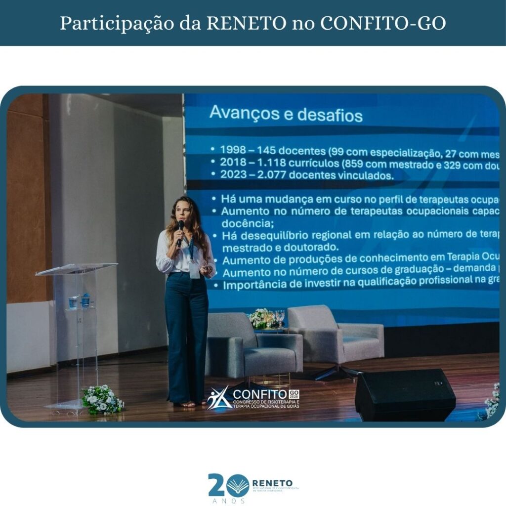 A RENETO participou do evento sendo representada pela Profa. Dra. Sarah Lins (UnB), secretária de comunicação da diretoria nuclear, que participou da mesa de Ensino, e apresentou uma palestra sobre o “Ensino e a pesquisa em Terapia Ocupacional: panorama atual e perspectivas futuras”.